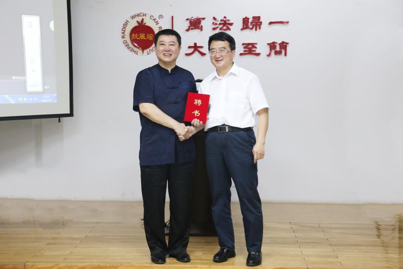 藥科大學(xué)副校長程卯生(右)為抗風(fēng)竤董事長張芮袀(左)頒發(fā)聘書