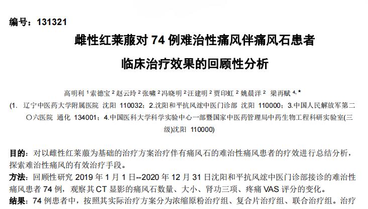 其余投稿的兩篇論文分別為《雌性紅萊菔對74例難治性痛風(fēng)伴痛風(fēng)石患者臨床治療效果的回顧性分析》、《雌性紅萊菔凍干濃縮原粉對AGA模型大鼠抗炎、降尿酸及TLR-MyD88-1L-1β信號通路作用機(jī)制的研究》。
